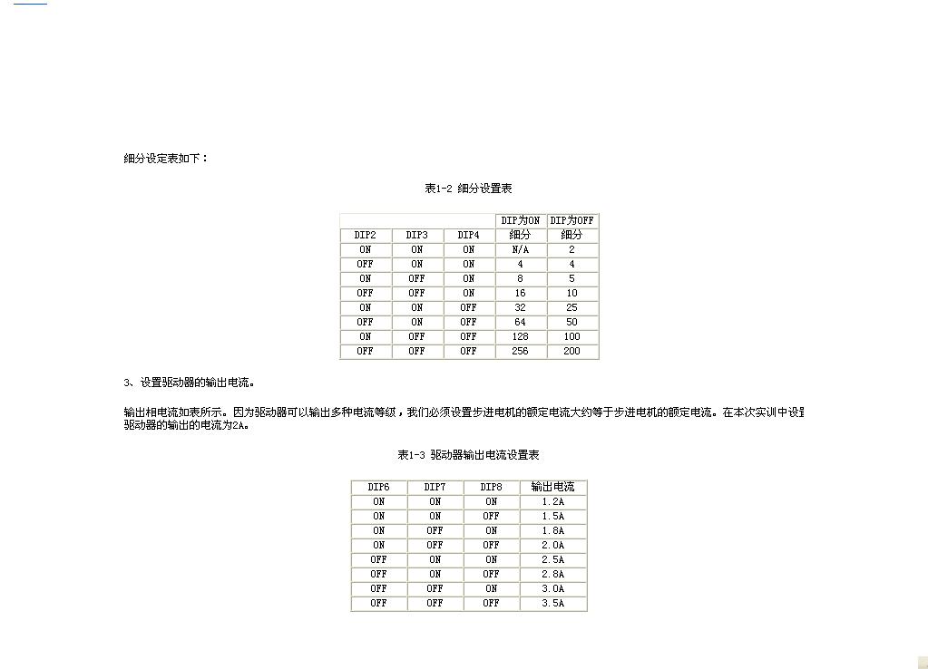 輸出相電流如表所示。因?yàn)轵?qū)動(dòng)器可以輸出多種電流等級(jí),我們必須設(shè)置步進(jìn)電機(jī)的額定電流大約等于步進(jìn)電機(jī)的額定電流。在本次實(shí)訓(xùn)中設(shè)置驅(qū)動(dòng)器的輸出的電流為2A。