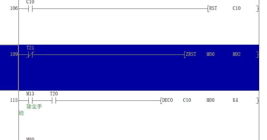 批次復位指令 T21如為ON則M80到M92十三個繼電器全部復位