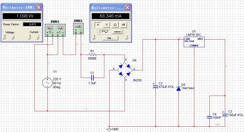用仿真軟件EWB8.0測得數據,XWM1為功率表,XMM1為交流電流表。個人認為本電路功率大部分為穩壓管所消耗。還請高手指正 。