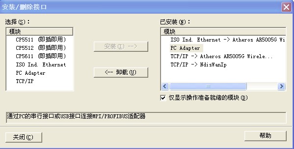 西門子軟件安裝完畢之后就應該有該接口,并且“安裝/刪除接口”窗口已經顯示安裝了PC Adapter驅動。