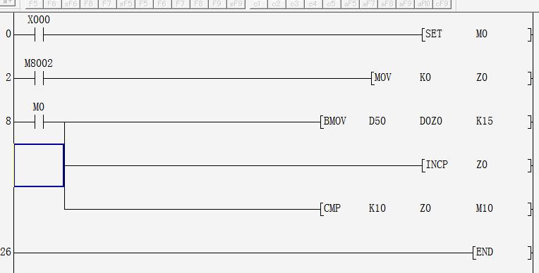 要將D0到D9的內(nèi)容批量傳送到D10~D19,只需要一條指令:BMOV    D0    D10     K10 。
