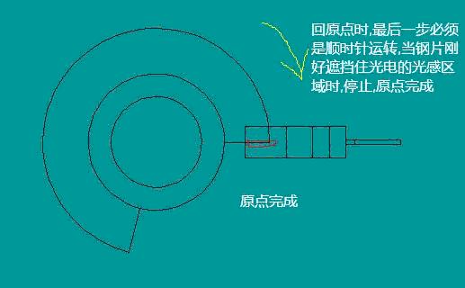 回原點時,最后一步必須是順時針運轉,當鋼片剛好遮擋住光電的光感區域時,感應器輸出信號,馬達停止運轉,原點完成。原點完成后運轉方向不用變更,因為馬達正常工作時也是順時針運轉