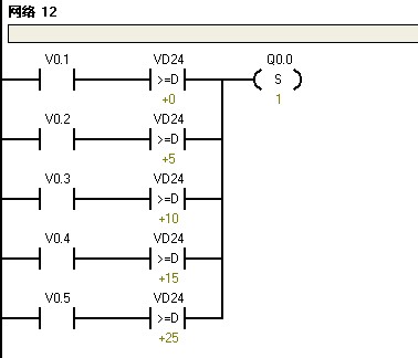網絡11:當V0.1~V0.5其中有值為1時,同時數值VD24有對應的值時,置位Q0.0。