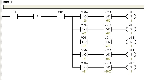網絡12:當I0.1上升沿且M0.1的狀態為1時;數值VD14值在20~50之間時置位V0.1。同理只要滿足數值VD14在值之間其有對應的結果。