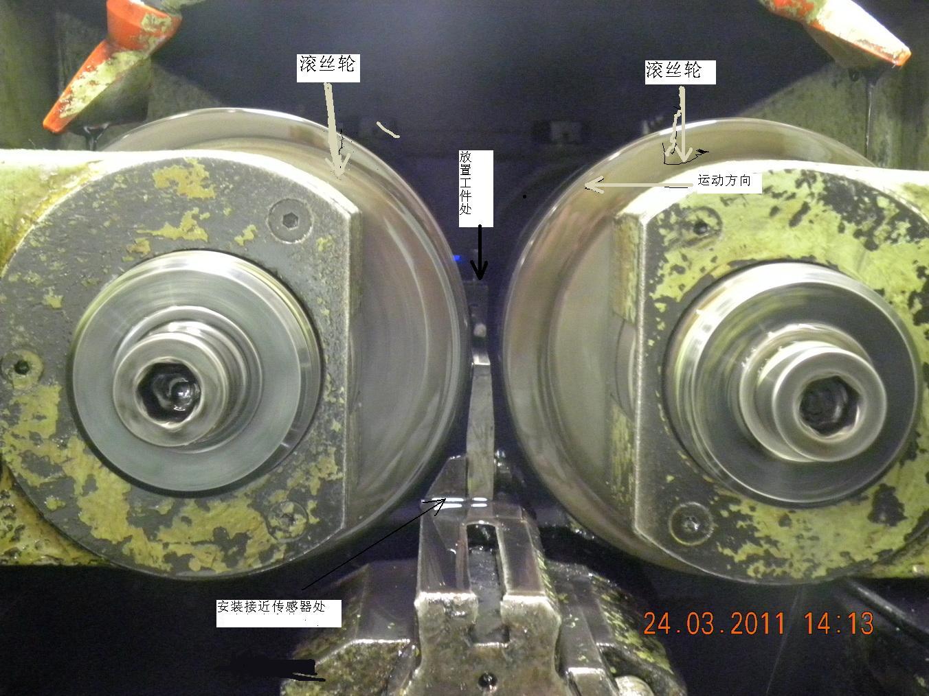 如圖所示:兩個滾絲輪,左邊滾絲輪為固定安裝,右邊滾絲輪加工時向左邊運動,工件放置在2個滾絲輪中間,每次擠壓工件,做滾絲加工。