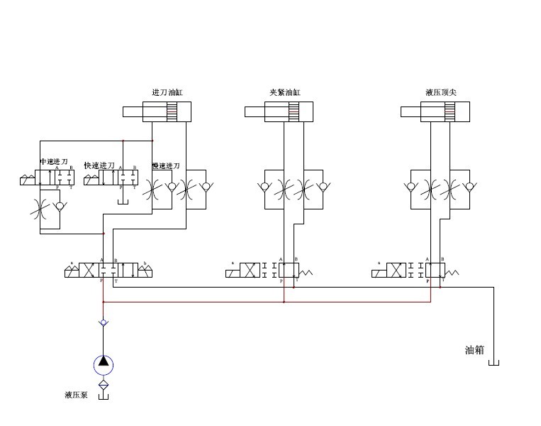 這是我改造液壓滾齒機(jī)的液壓原理圖,希望你能看懂。進(jìn)刀油缸可以走三種速度。