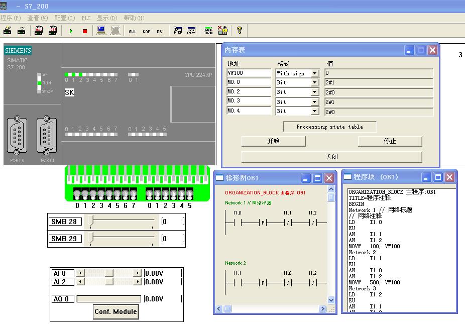 程序編譯通過沒有報警。將用戶程序在主程序界面下導出(指定文件存放途徑)保存,然后打開仿真軟件找到仿真程序(文件夾)確認裝載,確認,運行PLC。