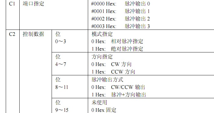 C2 0000000 0011 0011 0011 (H333) 通道0 通道1 絕對脈沖指令 CCW方向 脈沖+方向輸出 通道2通道3 相對脈沖指令 CW方向 CW/CCW輸出 |