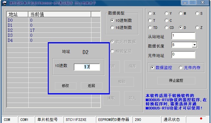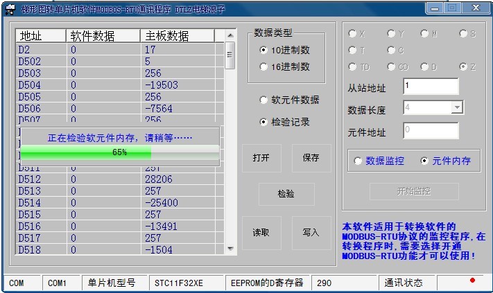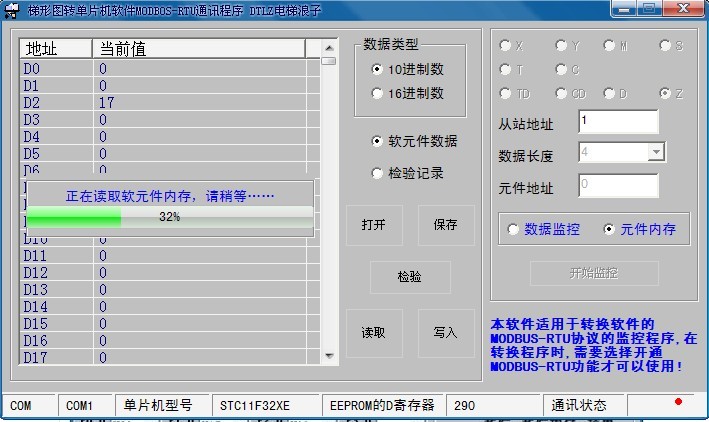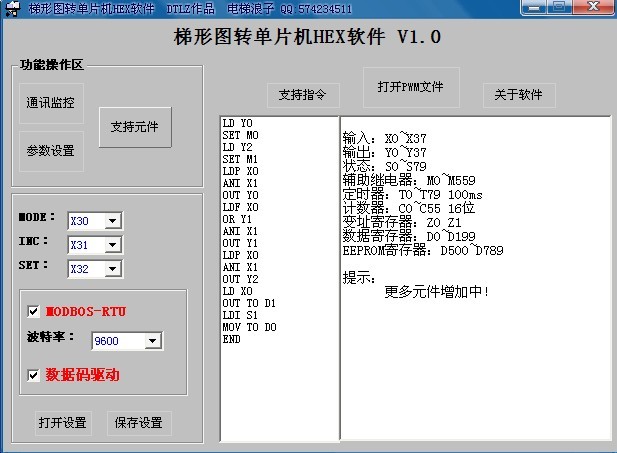 第三,軟件集成modbus rtu通訊程序,可以監控元件,并可以提取三菱編程軟件的軟元件內存DMW文件的數據