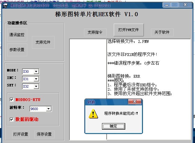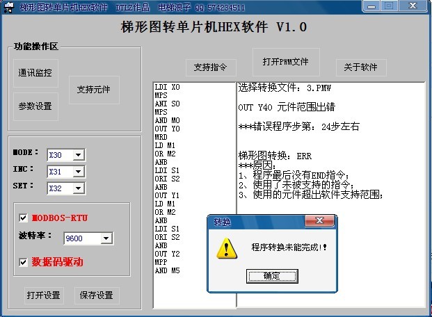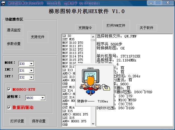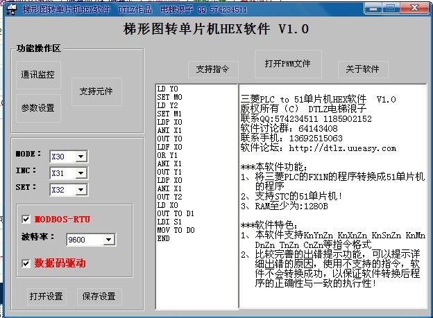 三菱PLC的FX1N梯形圖轉換為51單片機的HEX文件程序,本軟件完善了支持元件范圍檢測與支持指令檢測,并給出相應的出錯步數,使軟件轉換出的程序與PLC的執行保持一致,經過優化,支持200個RAM的D寄存器!500多個M輔助繼電器!使用本軟件,需要使用1280B的RAM的51單片機,程序容量建議選擇16K的!本軟件并集成了MODBOS-RTU通訊程序!支持EEPROM的D寄存器最多300多個!