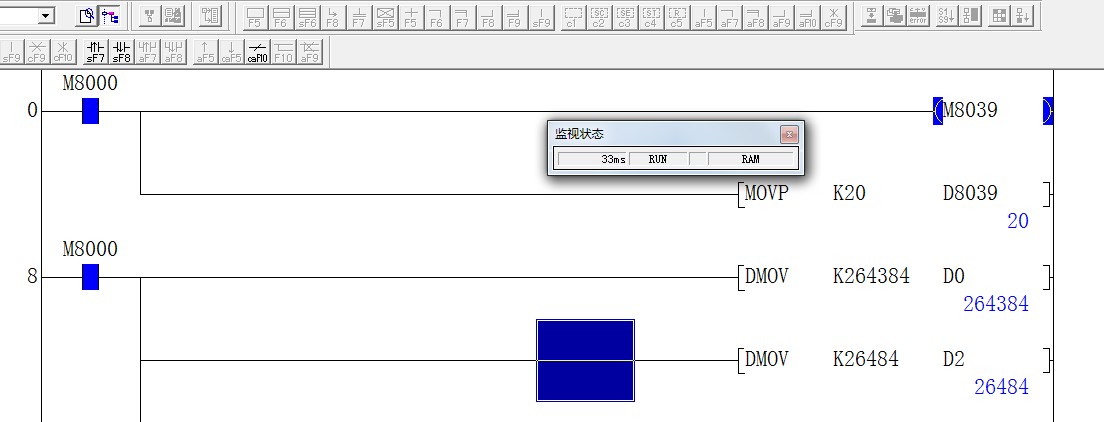 M8039:以1ms為單位恒定掃描模式,D8039是指定的掃描時間,以上程序的意思就是M8039變為NO后要等到20ms后才執行循環運算