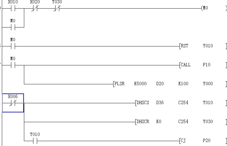 程序是用PLC的高速計數去實現步進電機的定位,我用的是專用步進電機驅動器,Y000為脈沖輸出到驅動器 Y010為驅動器方向控制,通斷實現正反轉,其中P10是從觸摸屏輸入數據后計算出來的總脈沖的子程序,X010是啟動按鈕  X020為急停按鈕 Y030是自動停止