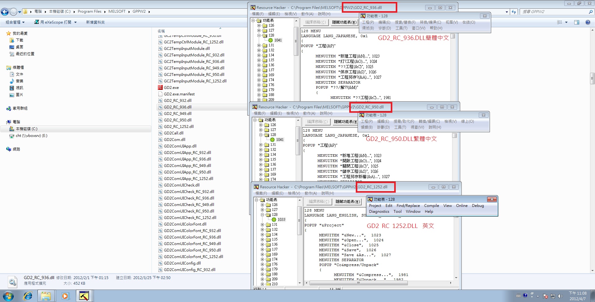 記的英文版語言檔是用 GD2_RC_1252.DLL,現簡中語言檔是用GD2_RC_936.DLL,有試著把GD2_RC_950.DLL改成GD2_RC_936.DLL,就是顯示繁中介面,不知哪位先進有辦法讓他直接讀取GD2_RC_950.DLL這些檔案(將**950.DLL改成**_936.DLL也是可行拉...不過超多要改....)