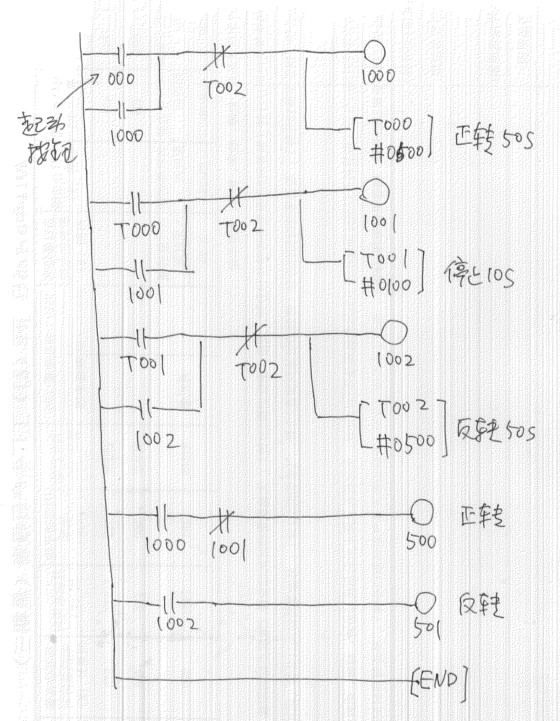 1、開機(jī)電機(jī)反轉(zhuǎn)自動(dòng)回到E點(diǎn),當(dāng)接到E點(diǎn)的接近開關(guān)信號(hào)后,電機(jī)正轉(zhuǎn)到C點(diǎn)后,電機(jī)停止3秒后,反轉(zhuǎn)到D點(diǎn),D點(diǎn)停止4秒后,D點(diǎn)到C點(diǎn)往復(fù)兩次后回到E點(diǎn)停下不動(dòng);