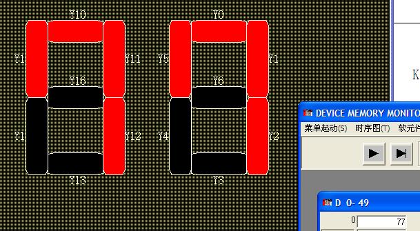 通過兩位七段顯示,可以顯示寄存器內(nèi)的值,寄存器內(nèi)的值變化,顯示也隨之變化,可顯示00-F9(十進(jìn)制159),F(xiàn)為高位(Y10-Y17),9為低位(Y0-Y7)。