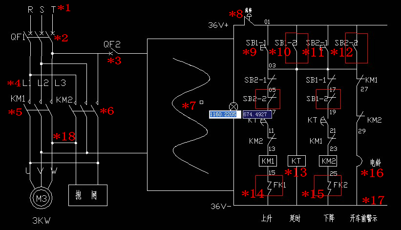 *14:—*15:“FK1”和“FK2”所示的圖形符號(hào)與文字符號(hào)是哪一類的器件?我個(gè)人猜測(cè),可能是“熔斷器”。如果是熔斷器,圖形符號(hào)與文字符號(hào)的標(biāo)注是錯(cuò)誤的。其文字符號(hào)是:FU1、FU2。況且,在這個(gè)控制系統(tǒng)中使用一個(gè)即可。該圖形符號(hào)繪制的位置:36V+端與急停按鈕前端之間。