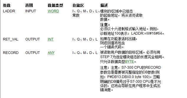 讀取的數(shù)據(jù)放在PLC的數(shù)據(jù)塊上 DB10.DBW0開始的的32個(gè)字節(jié)   ,那么RECORD就要寫  (代表存放首地址+字節(jié)數(shù))         P#DB11.DBX0.0 BYTE 32