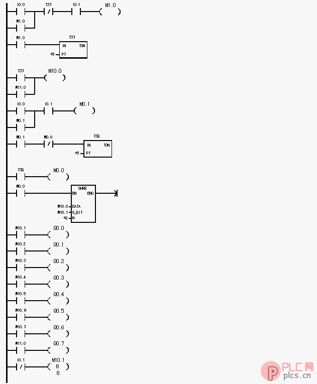 M10.0為數據輸入端DATA ,根據控制要求,每次只有一個輸出,因此只需要在第一個移位脈沖到來時由M10.0送入移位寄存器S-BIT位(M10.1)一個“1”