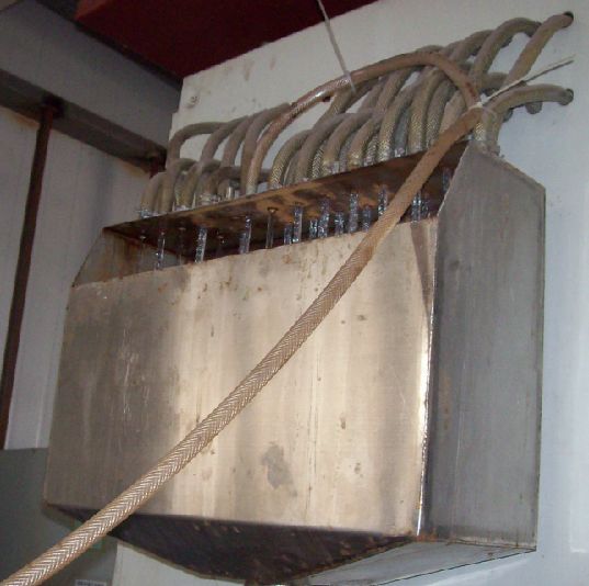 這是一臺中頻淬火電源的冷卻出水箱,上面有20多根出水管線,而每一根管線就是給中頻電源內部晶閘管、電抗器冷卻用的,當發現其中一根有水堵現象時,此時出水流量將會減少,很容易引起電源內部晶閘管、電抗器損壞,為此,我們工作一會就需要過去看看是否正常,我在想能否在每一根管線上加裝一根水溫傳感器,當水溫高的時候就說明有水堵現象,此時報警,然后再進行這根管線疏通,以避免引起器件燒壞現象,不知道使用什么形式的傳感器,特請教壇友們的幫助,附圖就是出水箱現狀,謝謝!