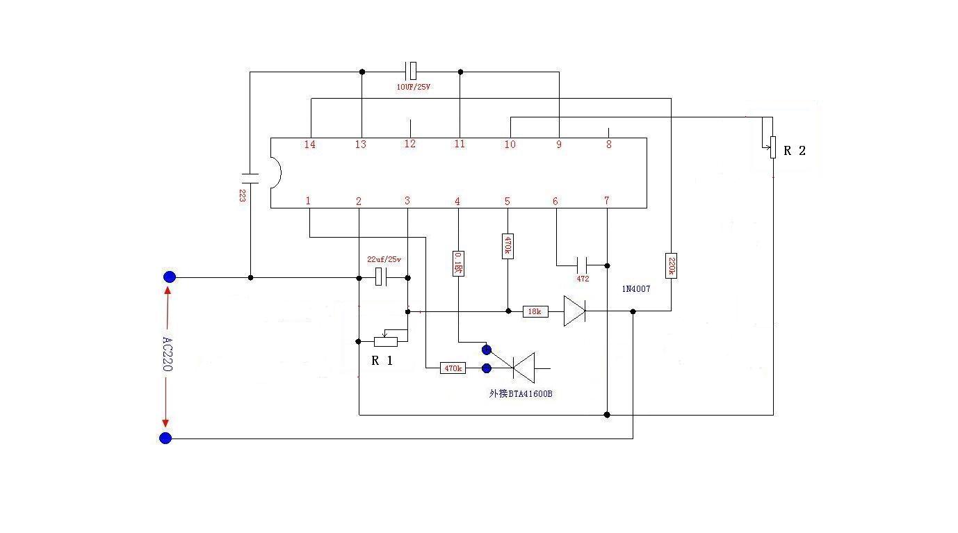 過零檢測觸發(fā)電路,IC有待分析,4N33達(dá)林頓管兩管都是通過100K電阻導(dǎo)通,復(fù)合管的C極與E極壓降保持穩(wěn)定,其中IC的10腳電壓應(yīng)是IC第2腳(VCC)的兩倍,IC第3腳為GND,2、7腳是VCC,2腳與7腳是電源電壓,也是4N33兩管的中點電壓,22UF是電源濾波電容,11腳與13腳的10UF電容為電源取樣濾波電容,220K為取樣電阻,還請樓主畫出BTA41600B的回路電路。。。