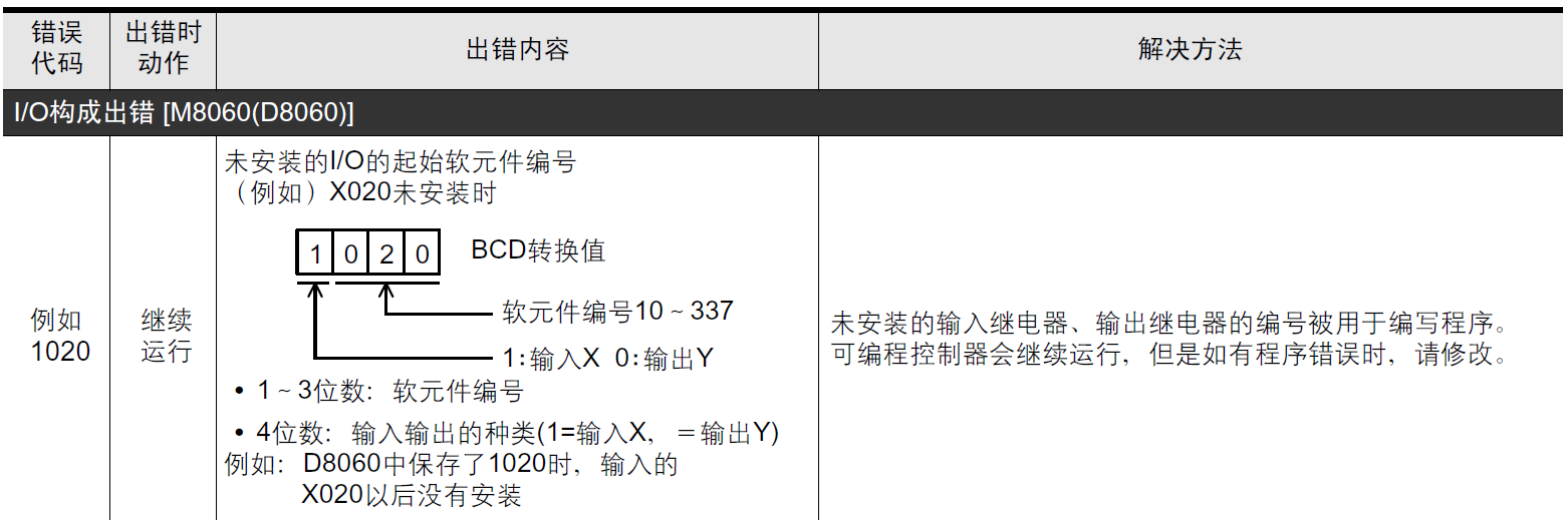 昨天,我拿公司拆下的PLC(型號為FX-2N 32MR),之后將程式輸入(程式內(nèi)容1.LD M8000  2.OUT Y0 3.END),之后發(fā)現(xiàn)PLC Y0的指示燈沒亮,但是Y0輸出的外部指示燈有亮,發(fā)現(xiàn)這種狀況,也把X0裝上去,利用電表確認(rèn)輸入端有電流輸入,不過X0的指示燈也沒亮,之后用程式診斷PLC后發(fā)現(xiàn),D8060有問題,不過手冊的解決方式看不懂,請大家?guī)蛶兔Π桑匆绾谓鉀Q