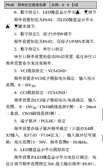 我把參數F00.0設置成6,面板控制.試車發現,還是只能用外接電位器VCI來控制頻率.我把F0.00里的參數從0-6都試了,還是一樣,