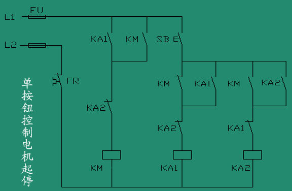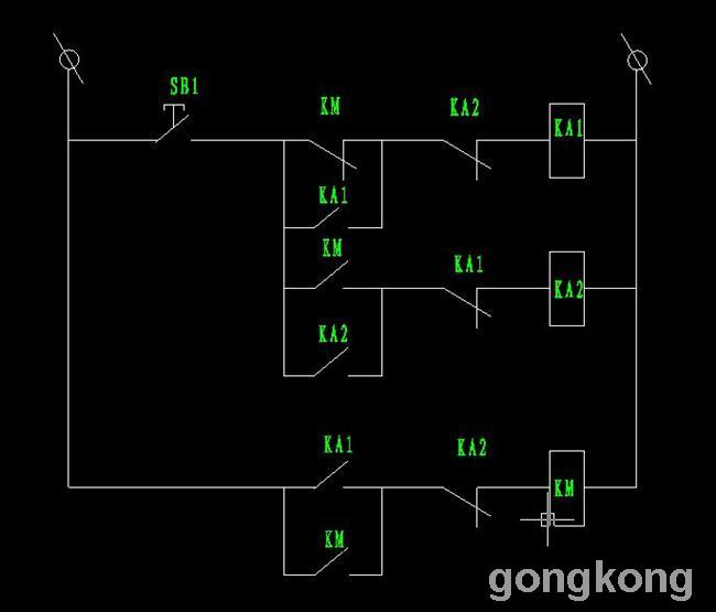 單按鈕啟停電路大家都畫個N多也說過N次,但小弟今天沒事做,用實際繼電器接了一個電路(圖如下),可并不是理想的,用PLC是沒問題,但用繼電器結果并不理想,按下第一次正確,在次按下時,KA2的一下電后就斷開,然后KA1就一直亮起,無法斷開KM。確認接線正確(還接了二次線),KM  KA1  KA2都采用MY4的普通繼電器,負載用一個24V燈。真是讓人不解,難到實際繼電器的響應不夠快?就沒有一個真正能達到效果的電路了嗎?請高手幫分析,謝謝。我想下圖也是很多人公認可以實現的電路!!!