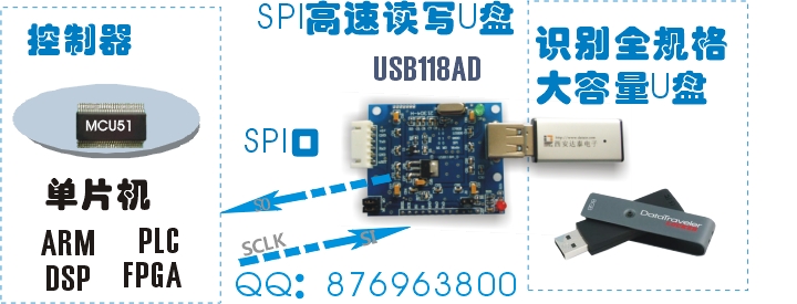 只要將USB118AD模塊嵌入到用戶系統中,用系統的主控單片機串口或者SPI口與USB118AD模塊的通信接口連接,將外接U盤的USB插座引到設備殼體上,用戶就可以非常方便的通過普通U盤實現儀器或設備數據的海量存儲。