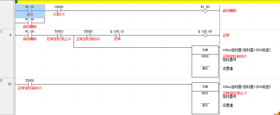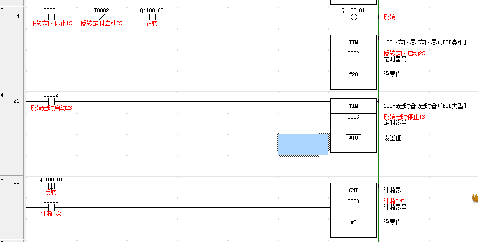 按下啟動按鈕,電機正轉2S,停1S,然后反轉2S,停1S,如此循環(huán)5次,電機停轉。