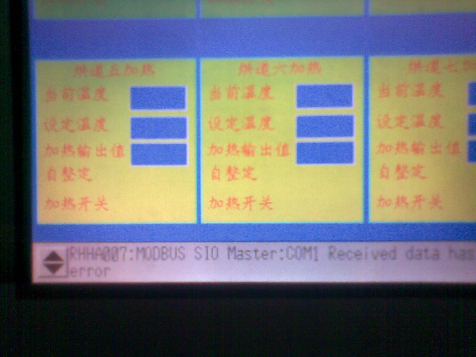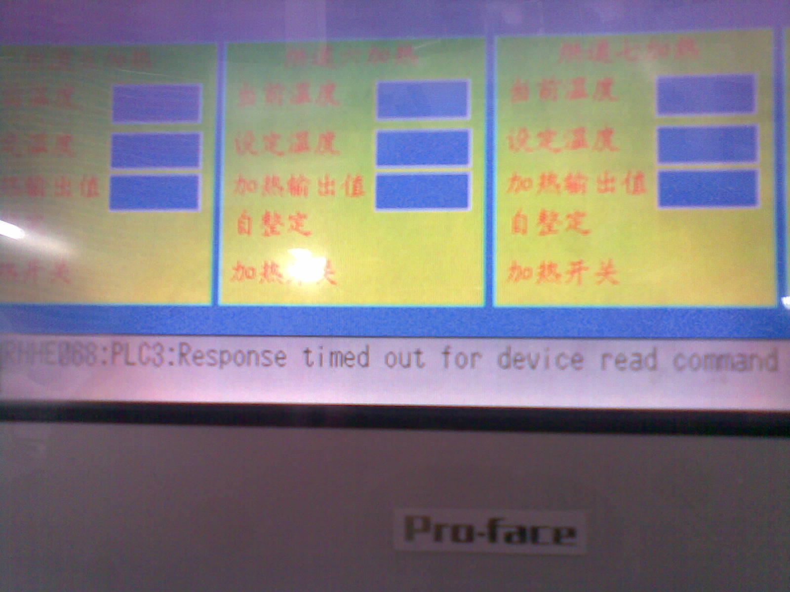 這段時間在調試一臺涂布機時有這么一個問題,就是如果啟動機器并把烤箱的進風風機和抽風風機都打開的話,觸摸屏溫控那個頁面內的的設定溫度,顯示溫度等等一些參數過很長一段時間都不能顯示出來(RKC溫控模塊與pro-face觸摸屏是通過屏蔽雙絞線進行485通訊的)。顯示正常時與不正常的畫面如上圖。(報錯提示:RHHA007 MODBUS SIO Master:COM1 Received data has been framing error        RHHE068 PLC3 Response timed out for device read command)請問各位大俠這是什么回事呢。想了很多的法都不能解決也沒有找到是什么原因。現在準備加裝一個信號隔離放大器。但是現在也不能確定裝了隔離放大器后能不能把這個問題給解決。請各位大俠指點指點啊。
