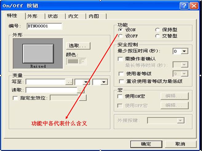 多看看說明書。功能:指按鈕按壓時是ON(通),OFF(斷),保持型(按通放開斷)還是交替型。狀態:指按鈕通斷狀態。