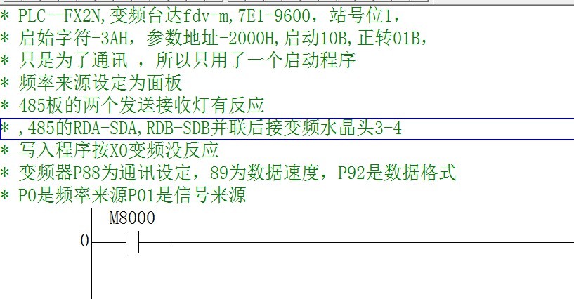 引用引用樓主史文華于2013-10-31 15:45發表的 幫我看看FX2N,VFD-M通訊付程序 :請朋友幫我看看FX2N,VFD-M通訊不上,程序那里問題,通信學了一個月了,第一次上機實驗,程序內有參數說明。謝謝各位。