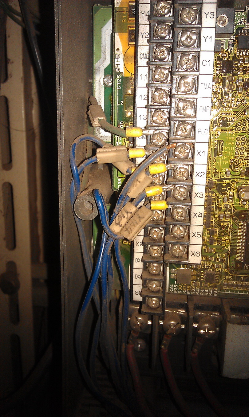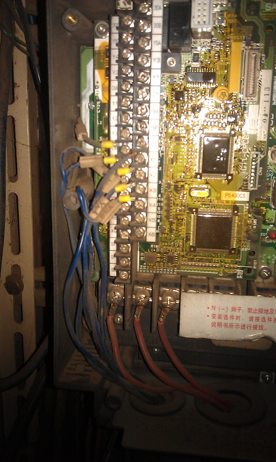 今天遇到一富士變頻器控制一條皮帶加減速,這條皮帶有高低速,可以正反轉(zhuǎn),皮帶有15種速度,每種速度分別可調(diào)(只調(diào)一個方向的高速,低速是固定的,而且是采用按鈕加減速)。這15種速度的識別是由PLC的4個輸出點控制(初步推斷,未能查線核實),皮帶的正反轉(zhuǎn)及高低速由PLC輸出點控制,皮帶的加減速用2個按鈕控制,這2個按鈕分別接到PLC的X123與X124兩個輸入點上,變頻器的控制神就神在這里,加減速由PLC的兩個輸入點控制,但這組PLC并沒有模擬量之類的模塊,只是基本的輸入輸出模塊,這個變頻器的控制線只有7條(1條公共線,正反轉(zhuǎn)各1條,剩下的4條接在變頻器的X1、X2、X3及X4端子上),我看了一下參數(shù)設(shè)置,變頻器的頻率信號給定方式設(shè)置是“0”