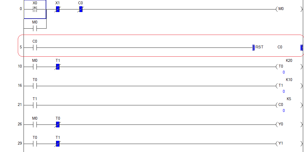 我寫的梯形圖如上圖,調試時,到C0到5時,Y1與Y2停下來后,重新啟動x0就不能重新啟動循環了,得斷電才行,請問要用什么條件來使CO rst?