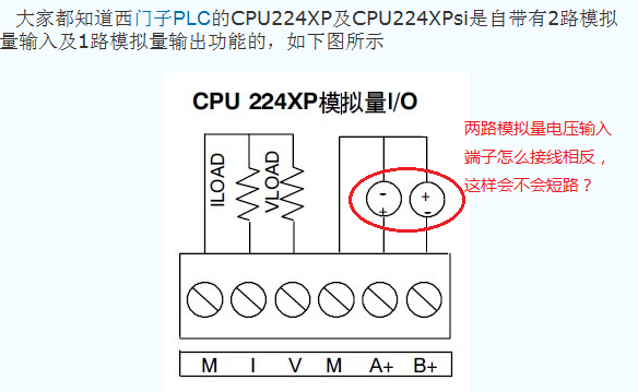 西門子200 CPU224XP CN 自帶模擬量輸入端子接線,如圖所示,查了好多都是這樣的,這樣沒有問題嗎?會不會短路?