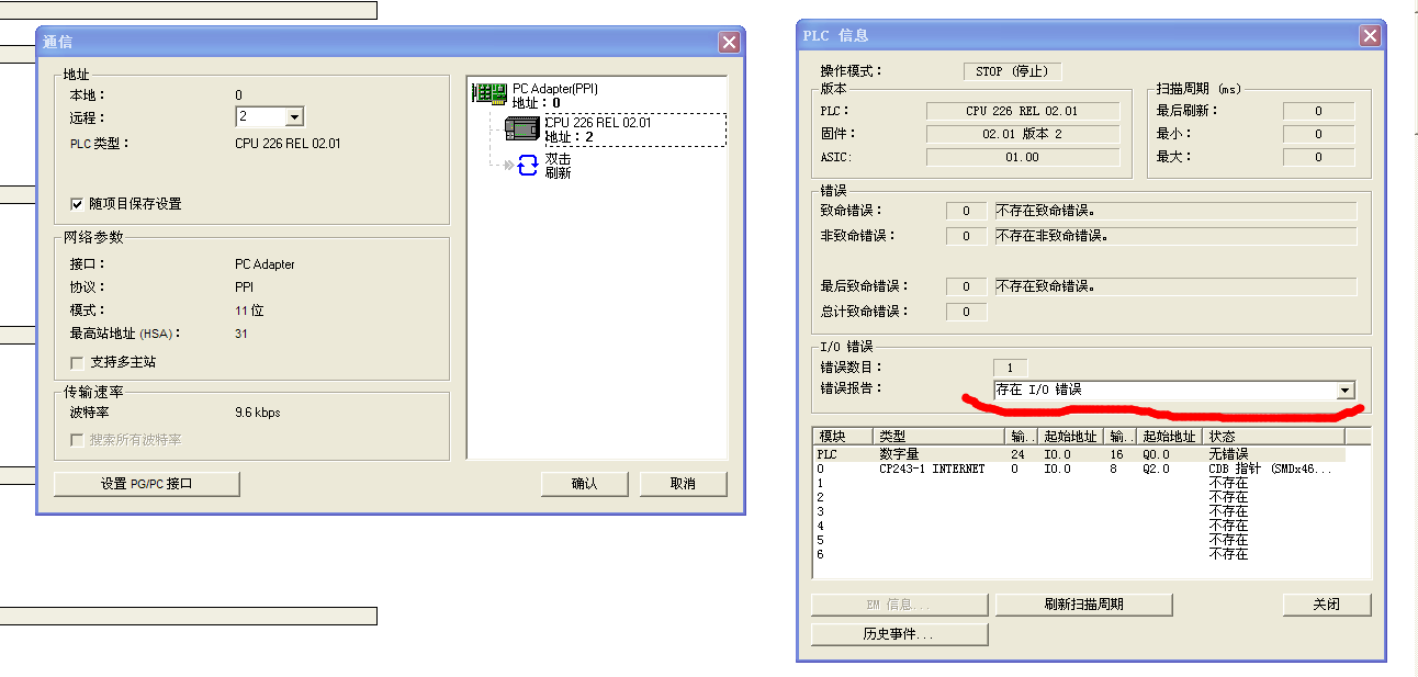 通訊PG/PC接口用的是PC Adaper(PPI),刷新后可以顯示通訊,雙擊plc會有提示plc消息,有錯誤為存在I/O錯誤。我的cpu為226訂貨號為216-2BD23-0XB0,后面接了通訊cp243-1,別的沒接,I/O口錯誤和沒接輸入輸出有關系嗎?謝謝工友朋友回答。