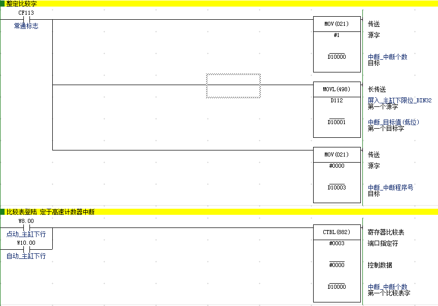 我使用高速計數器3進行計數,當計數值和D112的值一致的時候進行中斷。我看了歐姆龍CP系列編程手冊和CP1H操作手冊了,按照里面的提示進行編程,但發現無法進行中斷啊。大家能看看我這個程序有什么問題嗎?