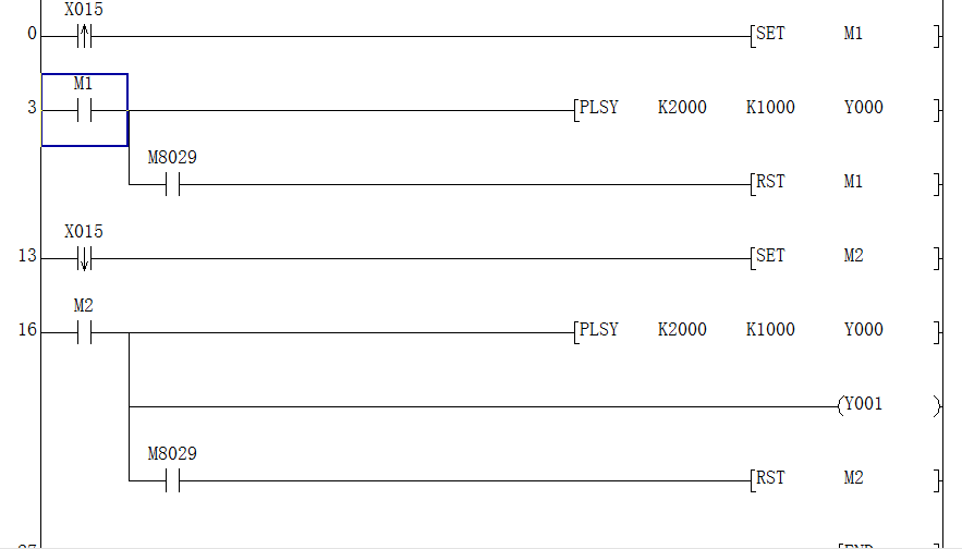 PLC是FX1S的,控制一個簡單的步進正反轉,可就是電機速度不夠快,要求電機每秒轉三圈的速度,每次轉兩圈半就夠了,但現在給的脈沖頻率都2000了還是達不到,頻率再加高電機就堵了,驅動器細分的是每圈400個脈沖,X15是導通后有足夠時間再斷開的,程序如下,求大神賜教一下哪里出了問題