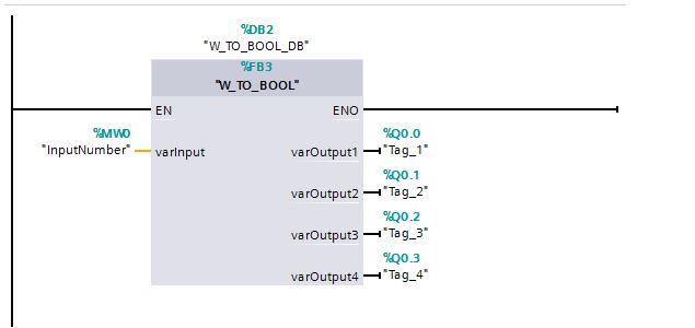 小弟用s7-1200想做一個功能塊。功能塊的輸入變量端是數值,輸出端是4個位(例如,輸入3,輸出為Q0.0和Q0.1),因為是4個位,所以最大輸入數值15.不知道如何直接傳送。也沒看到可以傳送數值到幾個位的指令。