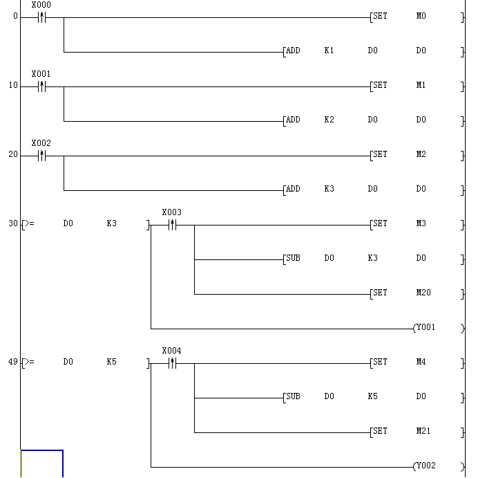 例如,X0,X1,X2實現(xiàn)D0的增加;X4,X5實現(xiàn)D0的減法。但只是通過給Y0不同的脈沖個數(shù),來控制單個數(shù)碼管顯示D0里面的內(nèi)容?