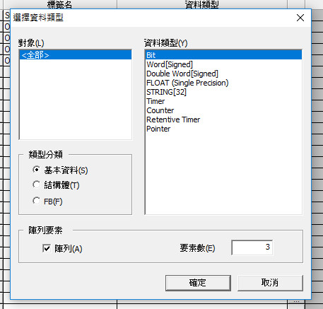 比較結果在功能塊程序里還要用,在主程序里不需要用所以m0標簽類型應該是VAR,標簽名取個"比較輸出A“,類型bit,設定數組為3,在下面程序里要用到M1,那這個標簽名怎么辦?