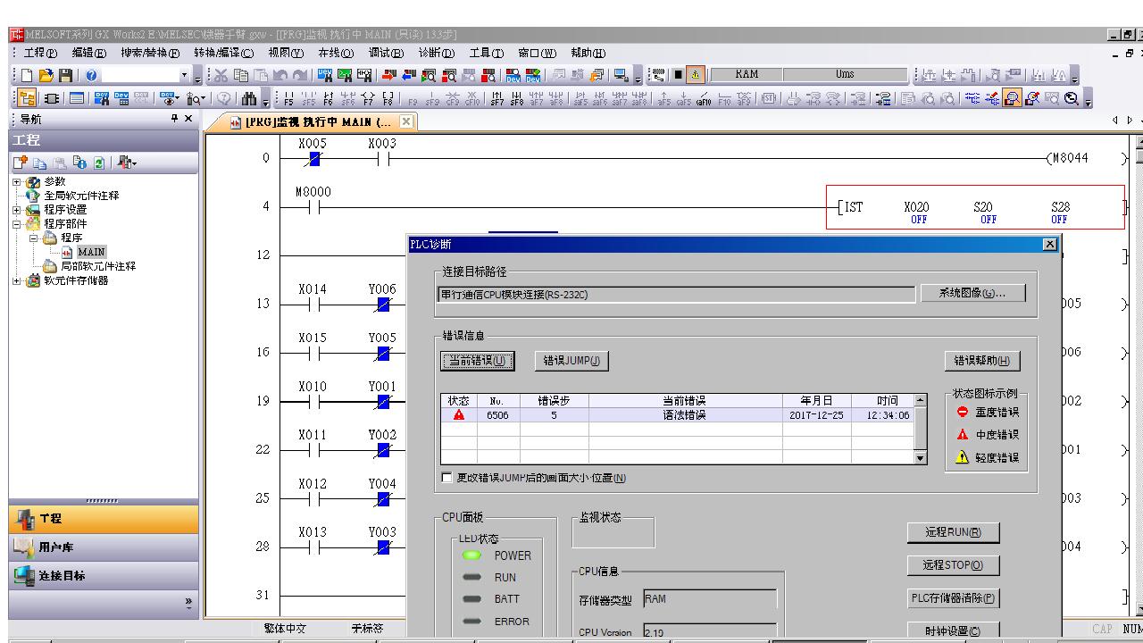 求大家幫忙看一下附圖所示,此程序用模擬運行沒有問題,但寫入后PLC報警出錯,PLC型號FX2N.