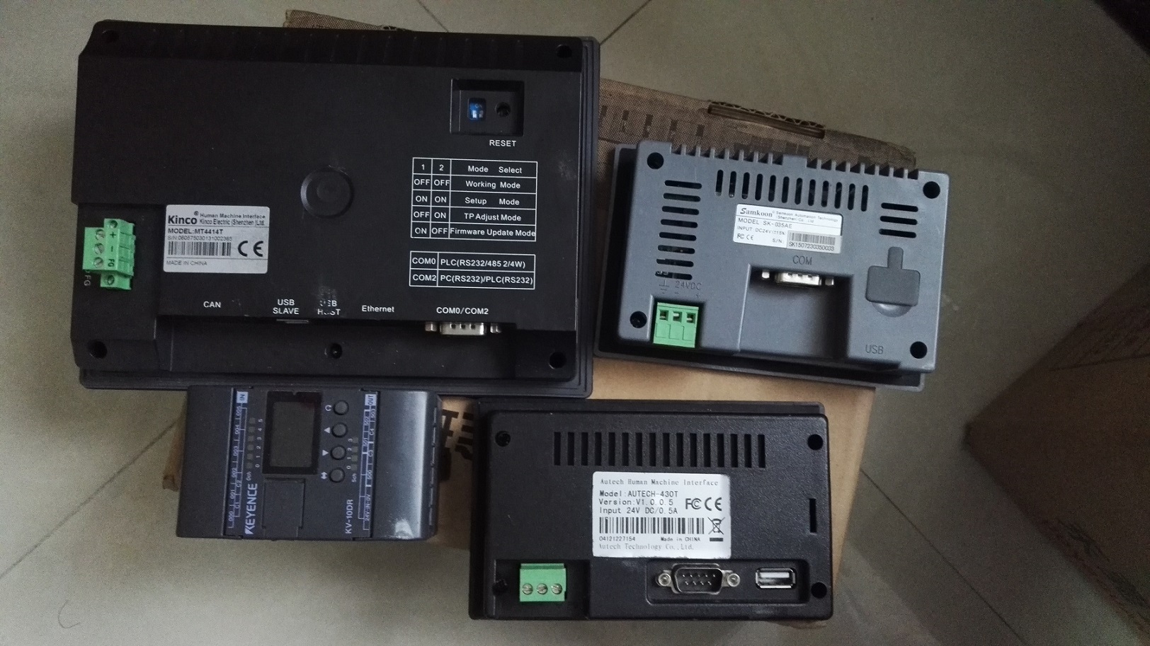 顯控SK-035AE 新的,沒灌過程序。   步科MT4414T右下角塑料被磨了一個小缺口,  奧提斯430T(永宏旗下的觸摸屏),有保護膜, 一個基恩士PLC。以上打包500不郵。