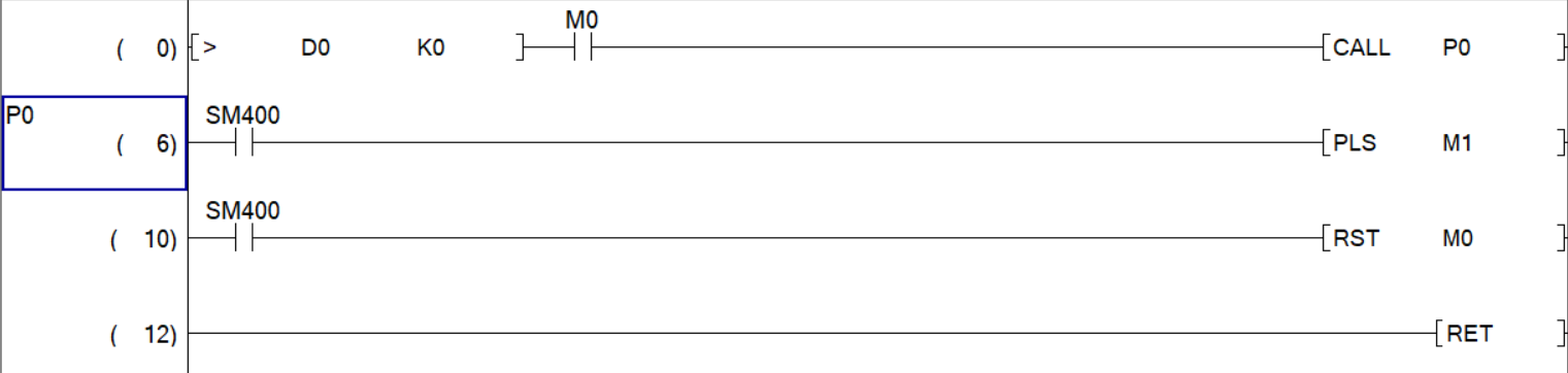 ,也就是CALL Pn 不生效時,CALL里面的語句PLC是不掃描的,里面的值就會像“凍住”一樣。所以CALL內部最好不要使用脈沖化指令。想要脈沖化,建議在條件加。