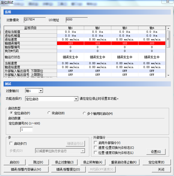 自己在學(xué)Q系列的PLC,Q01CPU,一個(gè)QD75D4模塊,其他模塊忽略,簡(jiǎn)單設(shè)置PLC參數(shù)的IO分配設(shè)置之后,直接啟動(dòng)QD75的定位測(cè)試,無(wú)程序,點(diǎn)確定后直接報(bào)警103,點(diǎn)擊顯示說(shuō)計(jì)算機(jī)和CPU之間無(wú)法連接。我在網(wǎng)上買的通訊線,很便宜的那種,RS232是用是PCI轉(zhuǎn)232硬接口,非USB轉(zhuǎn)232那種軟接口。現(xiàn)在是上下載程序正常,就是無(wú)法測(cè)試定位模塊,請(qǐng)教這是什么問(wèn)題。