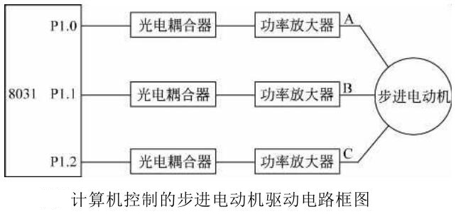 上圖是一個8031單片機(jī)與步進(jìn)電動機(jī)驅(qū)動電路接口連接的框圖。P1口的三個引腳經(jīng)過光電隔離、功率放大之后,分別與電動機(jī)的A、B、C三相連接。