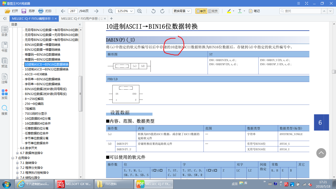 如圖,FX5U指令里,DABIN只說明是10進制ASCII轉換為BIN,但是現在數據是16進制的ASCII碼該如何轉換成BIN