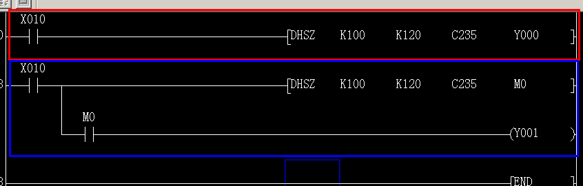 藍格的也是一個DHSZ高速區間比較,比較結果不經掃描MO直接輸出,然后再驅動Y0輸出,(這個疑問是,YO的輸出是經M0來驅動的,是否經過PLC的掃描周期影響?還是跟上面紅格的結果一樣,不經過PLC的掃描周期影響)