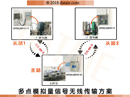 用一套模擬量無(wú)線傳輸裝置DTD110FCY實(shí)現(xiàn)模擬量信號(hào)的兩發(fā)一收功能。兩個(gè)無(wú)線信號(hào)發(fā)射端分別接入轉(zhuǎn)換成標(biāo)準(zhǔn)4—20mA的溶氧傳感器信號(hào)(對(duì)應(yīng)于0-100mls),安裝在味精成品檢驗(yàn)主控室的無(wú)線信號(hào)接收端接收到信號(hào)后,進(jìn)入二次儀表,還原信號(hào)送入DCS系統(tǒng)并直接在電腦上顯示溶氧濃度。