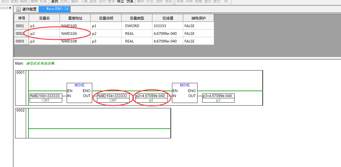 數(shù)據(jù)格式不同,MD100的格式是DWORD,也就是32位16進(jìn)制(雙字)格式,而MD104和MD108都是浮點(diǎn)數(shù),PLC里面的如果沒(méi)有使用進(jìn)制轉(zhuǎn)換指令而是直接MOVE的話,一般都是按照16進(jìn)制格式轉(zhuǎn)換的,也就是收縮MD104里面的浮點(diǎn)數(shù),如果用32位16進(jìn)制顯示的話,就是MD100里面的數(shù)了。